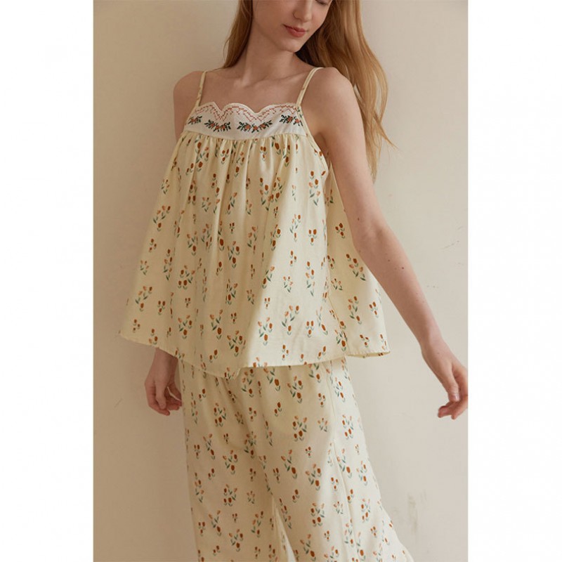 Etiquetas: Cotton Double-Layer Gauze Strap & Shorts Set - Bohemian Embroidery Loungewear