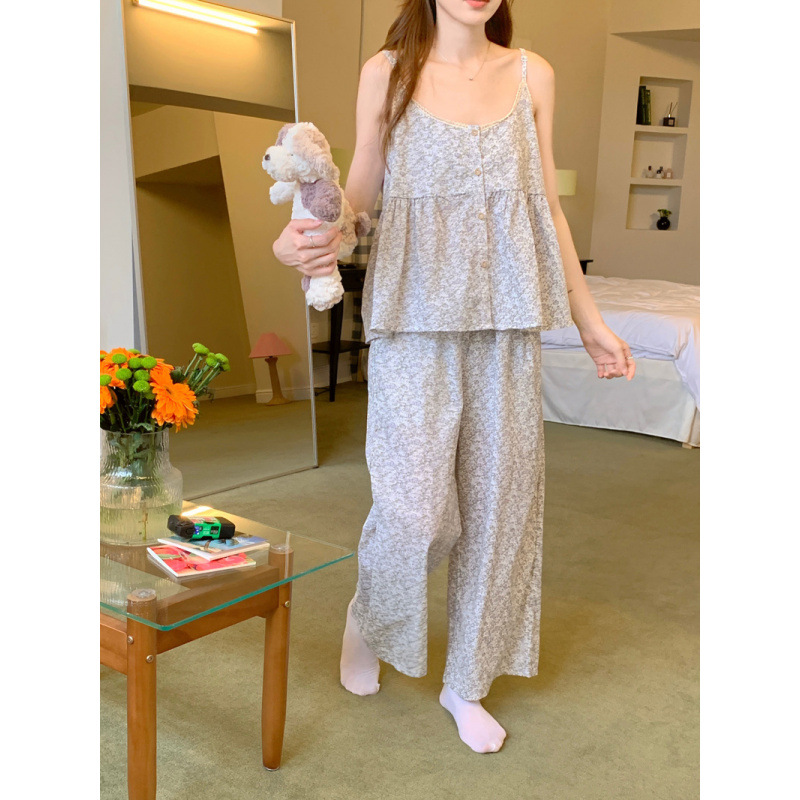 • Diseño Encantador y Femenino: La camiseta presenta un delicado escote en pico y tirantes con volantes, añadiendo un toque romántico y dulce. El pantalón largo a juego completa el look con elegancia y confort.