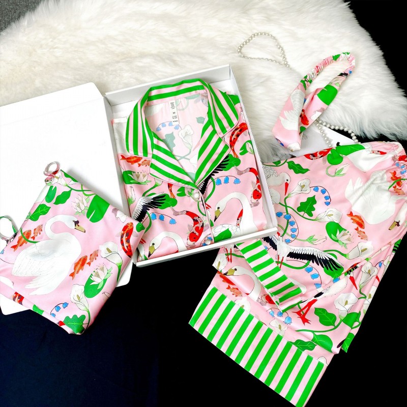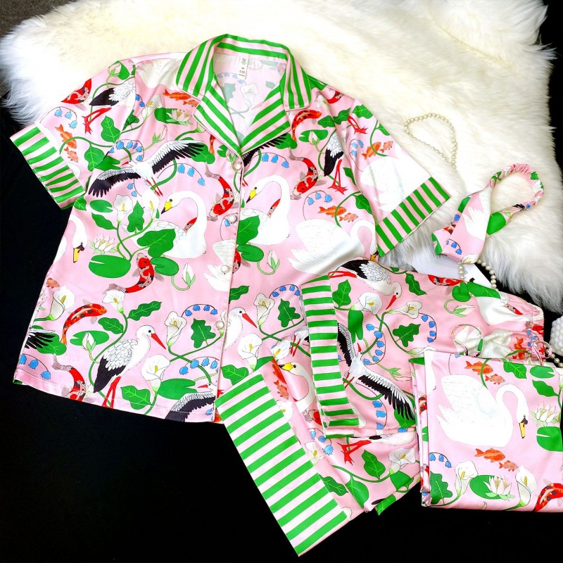 ---Cool and breathable imitation silk homewear set with an elegant crane print. Loose fit, plant-based dye, and suitable for all seasons.Summer Ice Silk Crane Print Loose Women's Five-Piece Homewear Suitable for Outdoor Wearice silk homewear, women's homewear, crane print, five-piece set, imitation silk, summer homewear, loose, plant-based dye