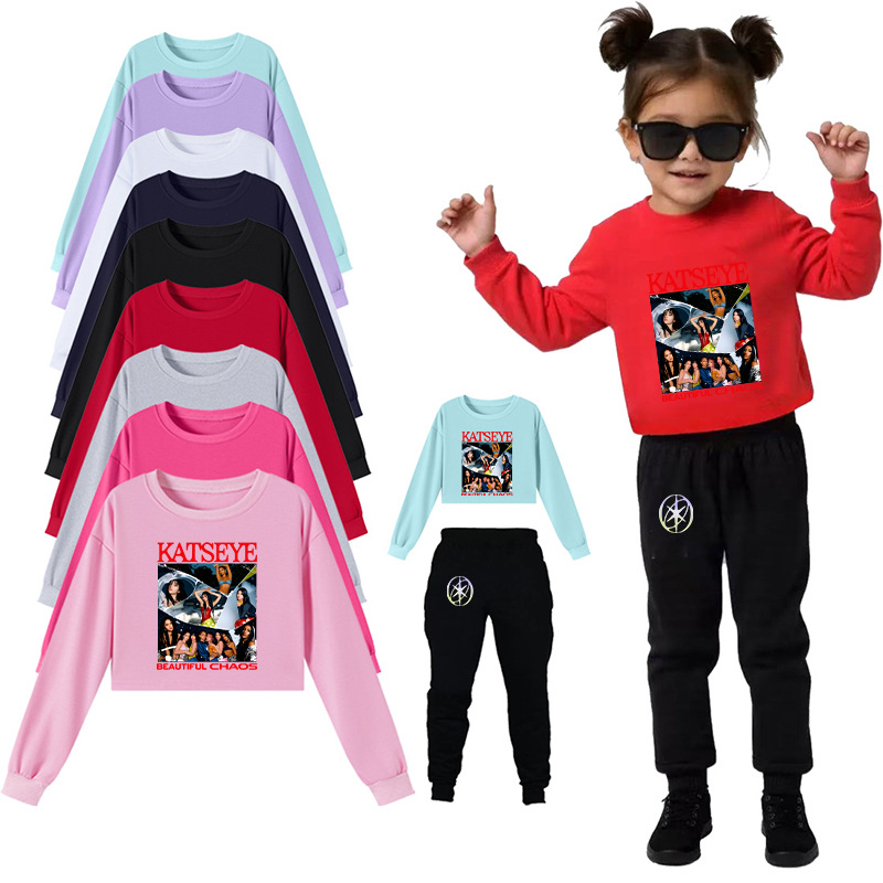 Etiquetas: KATSEYE merch for kids, kids cotton conjuntos de pijama, unisex toddler sportswear, girls graphic sweatshirt set, boys joggers set, 100% cotton kids loungewear, KATSEYE beautiful chaos clothing.