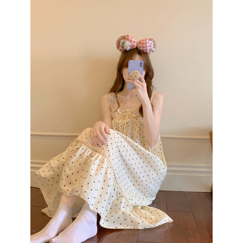 Etiquetas: summer camisole dress, polka dot sleepwear, lace-trimmed dress, convertible nightgown, apricot A-line dress