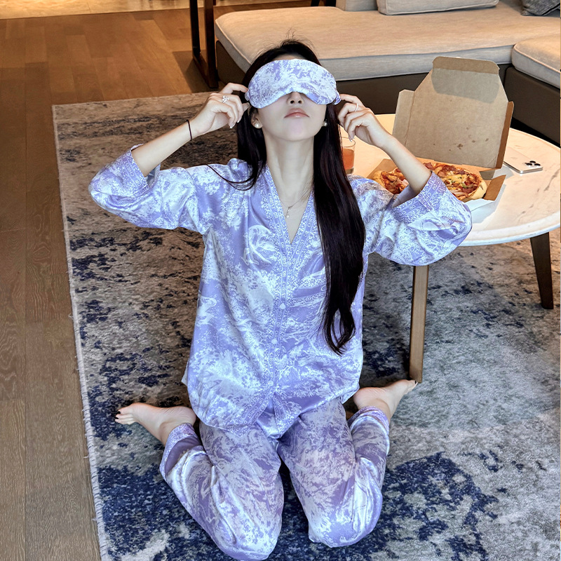 Purple Ice Silk Ink Painting Print Tie-Dye Long Sleeve Long Pants Thin Turn-down Collar Women's Pajama SetCool and breathable imitation silk pajama set with a unique purple ink painting print and tie-dye design. Moisture-wicking, quick-drying, and wrinkle-resistant. Perfect for both home and casual wear.Purple Ice Silk Ink Painting Print Tie-Dye Long Sleeve Long Pants Thin Turn-down Collar Women's Pajama Setice silk pajamas, women's pajamas, ink painting, tie-dye, imitation silk, purple pajamas, moisture-wicking, breathable
